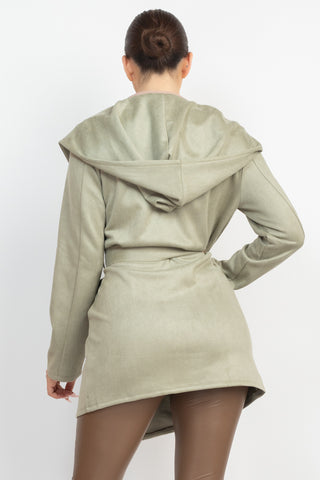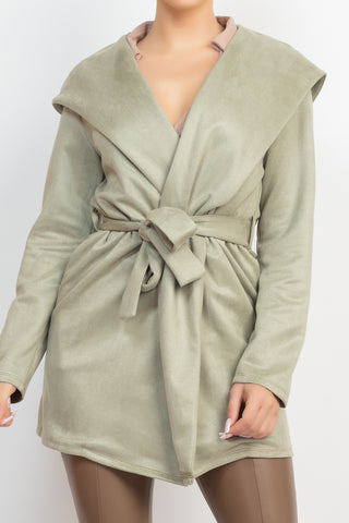 Imported S.M.L A suede outerwear jacket in solid color featuring a hood, waist-tie detachable belt sash, also can be worn open-front and long sleeves 96% Polyester 4% Spandex Ice Sage IRI
