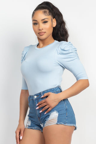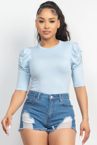 Round Neck Puff Ruched Sleeve Top