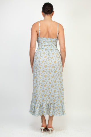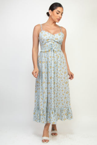 Product Description: Breezy and beautifully detailed, this ruched ditsy ruffled hem dress captures the essence of easy summer elegance. Featuring an allover floral print, the midi silhouette is enhanced with delicate ruching along the bust and waist for a flattering, feminine shape. The sweetheart neckline with center tie detail adds a romantic touch, while adjustable spaghetti straps ensure a perfect fit. Crafted from lightweight woven rayon, it drapes softly and comfortably against the skin. A ruffled hem completes the look with a soft, flowy finish perfect for warm days and special occasions alike.