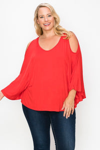 Made in U.S.A1XL.2XL.3XLSolid top featuring kimono style sleeves with open shoulders.94% Rayon 6% Spandex Red POL