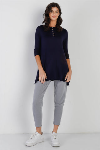 Imported S.M.L.XL Navy, solid color, midi sleeves, round neckline, button up detail, relaxed fit, tunic style, unlined, stretchy, non-sheer, casual, simple, basic, perfect everyday look, must have 95% Rayon 5% Spandex Navy TSH