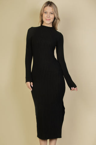 This dress is ideal for those seeking a cozy yet fashionable piece to wear during the colder months. The mock neck and long sleeves offer warmth, while the split thigh adds a modern touch that elevates the overall look. Whether for a day at work or a casual night out, this dress delivers both comfort and style.