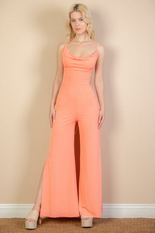 Ribbed Cowl Neck Backless Split Wide Leg Jumpsuit