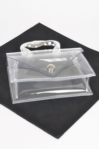 Elevate your accessory collection with our Transparent CCB Handle Flap Clutch, a chic and modern statement piece designed to add a touch of glamour to any outfit. Crafted with precision, this clutch combines sleek, minimalist design with practical functionality, making it a perfect addition to your wardrobe.