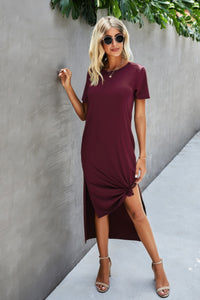 Scoop Neck Short Sleeve Side Split Dress - Wine / S