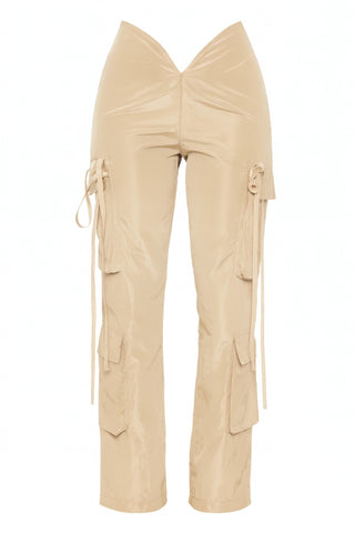 Product Description: Elevate your streetwear style with these V-Cut Cargo Pants, designed with bold structure and everyday functionality. Featuring a distinctive V-shaped waistline hem, these pants bring an unexpected edge to the classic cargo silhouette. The wide-leg fit and open front detail add movement and ease, while side cargo pockets provide utility and style. Made from a durable polyester-spandex blend, the fabric is non-stretch yet comfortably structured. Finished with a drawstring waist for an adjustable fit, these pants are perfect for pairing with crop tops, bodysuits, or fitted tees.