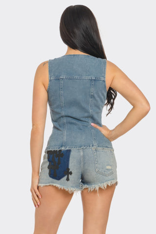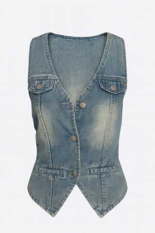 Product Description: This sleeveless vest denim top delivers a structured, versatile look with modern edge. Featuring a classic button-down front and flap pockets at the chest, it brings utility-inspired styling to a clean, sleeveless silhouette. The denim fabric is softened with a polyester-spandex blend, offering a comfortable fit with subtle stretch. Perfect for layering or wearing solo, this piece adds effortless cool to everything from tailored trousers to cutoff shorts. A staple for transitional seasons, it’s a go-to for laid-back polish.