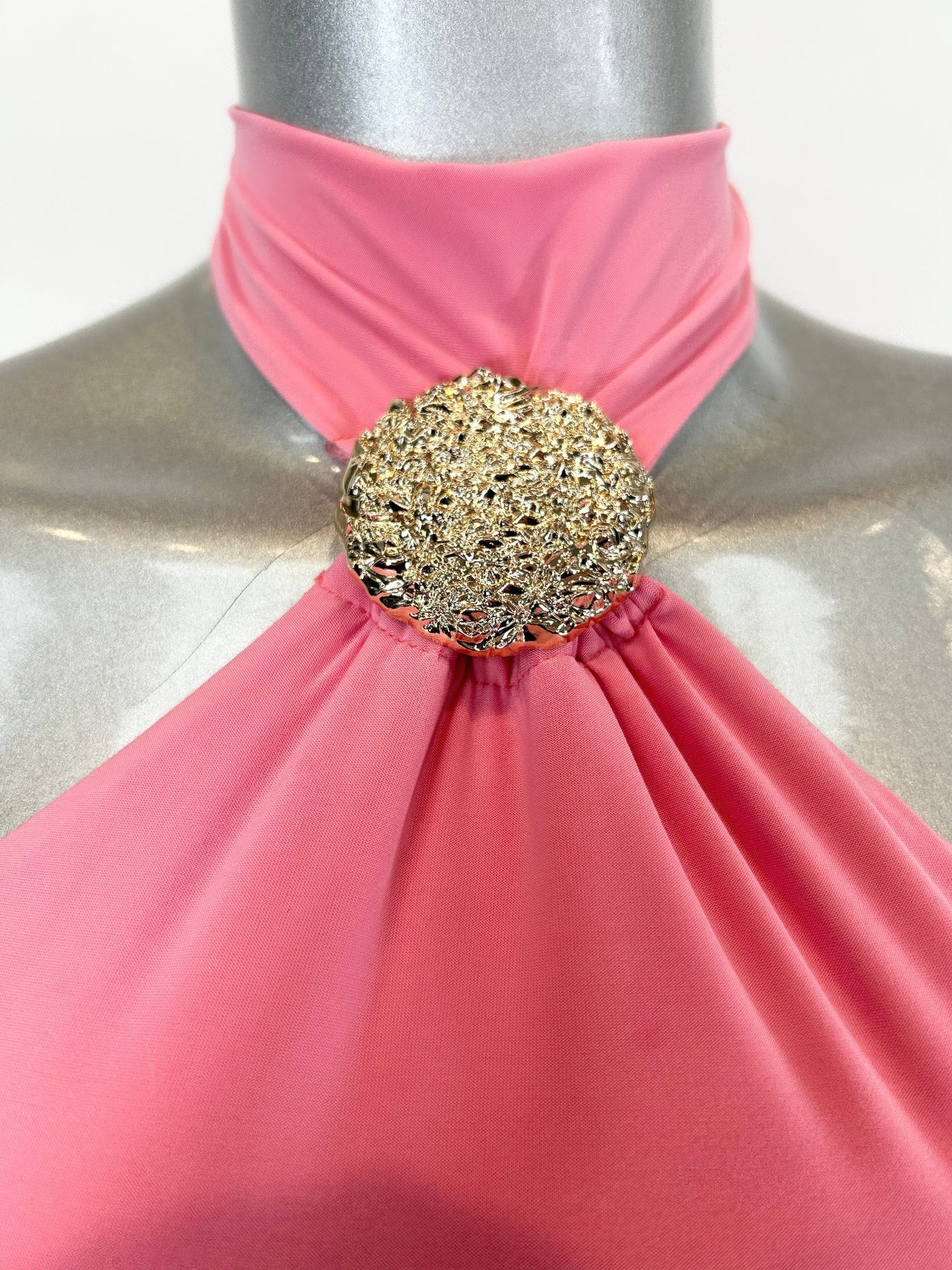 Halter neckline with gold brooch detail