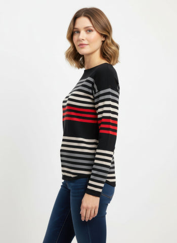 Product Description: The Ninety Striped Sweater offers a refined take on everyday comfort. Crafted from a soft viscose blend, this pullover features a classic striped pattern that adds timeless appeal. The boat neckline lends a touch of elegance, while the long sleeves provide cozy coverage. With its smooth knit and flattering fit, this sweater pairs effortlessly with denim, skirts, or tailored pants—making it a versatile staple for any season.