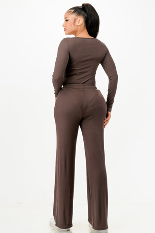 Product Description: Effortlessly sleek, the Long Sleeve Ribbed Bodysuit and Pants Set blends everyday comfort with modern minimalism. Featuring a form-fitting ribbed bodysuit with a square neckline and clean binding details, this set offers a flattering, streamlined silhouette. The wide-leg pants complement the top with soft structure and easy movement, making it perfect for daily wear or dressed-up moments. Available in six versatile colors, this set is ideal for back-to-school, weekend plans, or a polished off-duty look that feels as good as it looks.