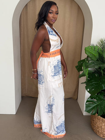 Product Description: Step into elevated resort style with the Italian Escape Halter Jumpsuit, a statement piece designed for warm-weather sophistication. Featuring vibrant Italy-inspired prints, this jumpsuit showcases a plunging halter neckline and wide-leg silhouette for a flattering, elongating effect. The lightweight fabric drapes beautifully, offering comfort without compromising style. Perfect for sunset dinners, seaside strolls, or summer events, it delivers bold elegance with effortless ease. Just add sandals or heels to complete the look.