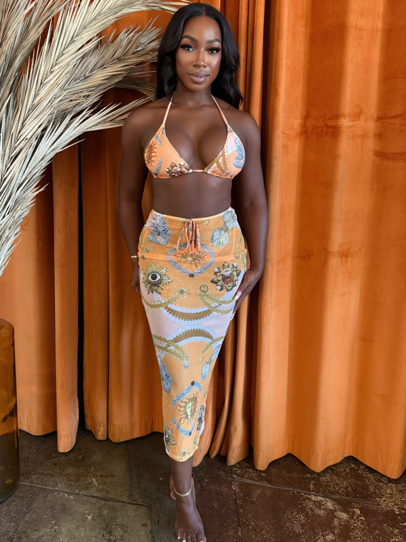 Product Description: The Solar Muse Cover-Up Skirt brings radiant energy to your resort wardrobe with its celestial-inspired design. Made from lightweight printed mesh, this midi skirt features a vibrant orange base adorned with sun and seashell motifs that evoke tropical ease. The adjustable drawstring waist ensures a personalized fit, while the sheer finish makes it ideal for layering over swimwear. Flowing and breathable, it’s the perfect complement to the Celestial Bikini or any poolside look that transitions from beach to evening.