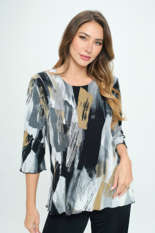 Product Description: This printed 3/4 sleeve top combines comfort with a touch of detail, making it an easy favorite. The merrow hem gives the silhouette a neat finish, while the round neckline creates a clean, classic shape. Made in a selection of unique prints, each version offers standout style. The lightweight stretch fabric flatters without clinging. Proudly made in the USA, this top pairs effortlessly with pants, skirts, or denim.