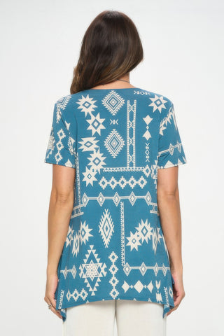 Product Description: Chic and comfortable, the BG Shark Bite Tunic stands out with its soft blue and sand tribal print. Designed with short sleeves and a flattering round neckline, it’s finished with an asymmetric sharkbite hem for movement and visual interest. Made from a smooth stretch fabric, this USA-made tunic flows with ease and flatters every figure.