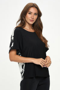 Product Description: This contrast dolman sleeve top makes an impression with its unique two-tone design—solid on the front and printed on the back. The high-low hem creates a flattering, flowy silhouette, while the rounded back adds movement and ease. Its relaxed dolman sleeves enhance comfort, making it ideal for everyday wear. Crafted from soft, stretchy ITY fabric, this top offers a perfect blend of style and flexibility. Whether dressed up or down, it's a versatile piece for your wardrobe. Proudly made in the USA.
