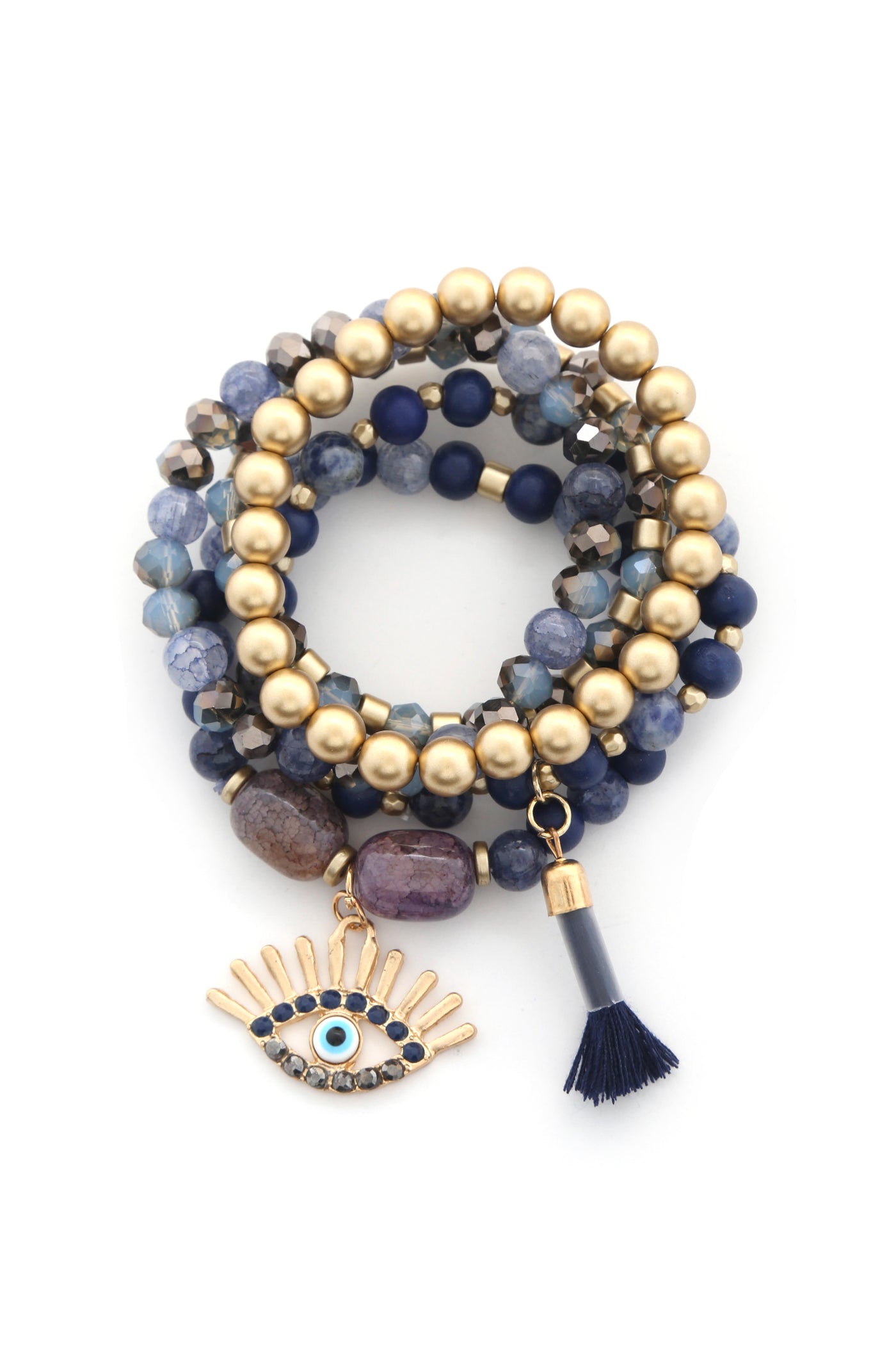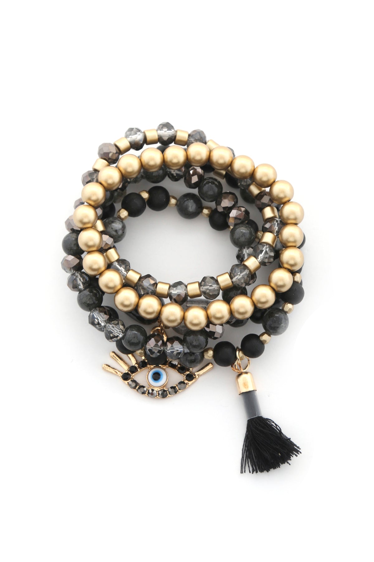 Imported EVIL EYE BEAD TASSEL BRACELET SET Black.Coral.Navy.Burgundy.Nude.Mustad FBJ