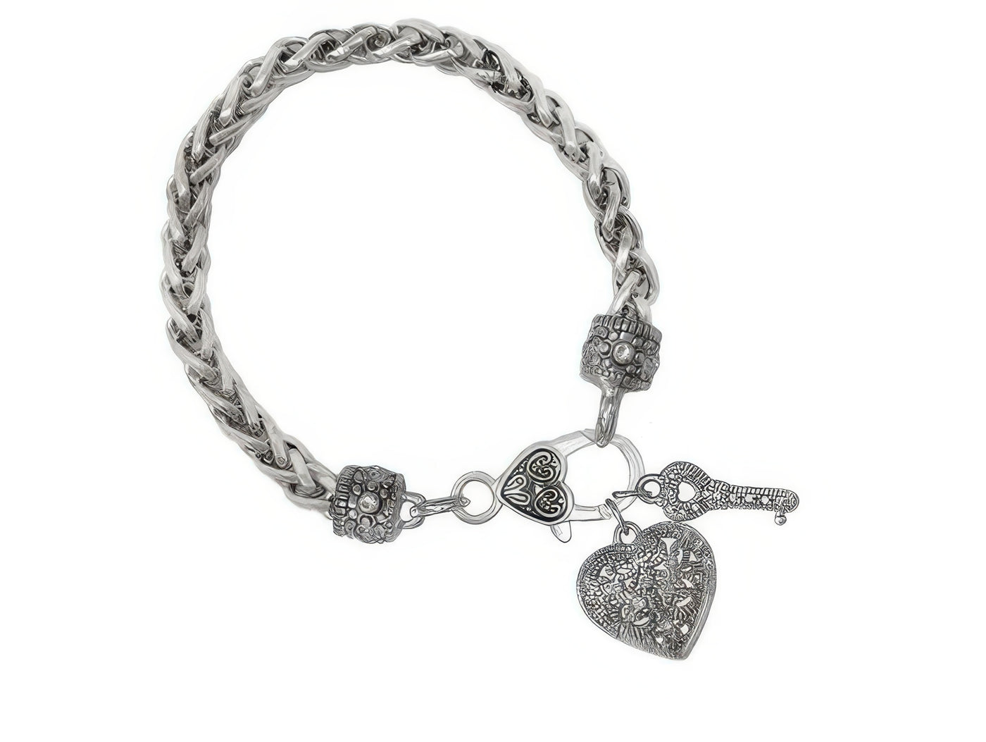 Product Description: This romantic charm bracelet pairs a filigree heart with a key charm, symbolizing love and connection. Finished in oxidized silver-tone metal, it features vintage-inspired detailing with a delicate chain silhouette. Whether for a special occasion or everyday charm, this piece brings timeless elegance to your jewelry rotation. The lobster clasp closure ensures a comfortable and secure fit. An ideal gift for anniversaries, date nights, or heartfelt moments.