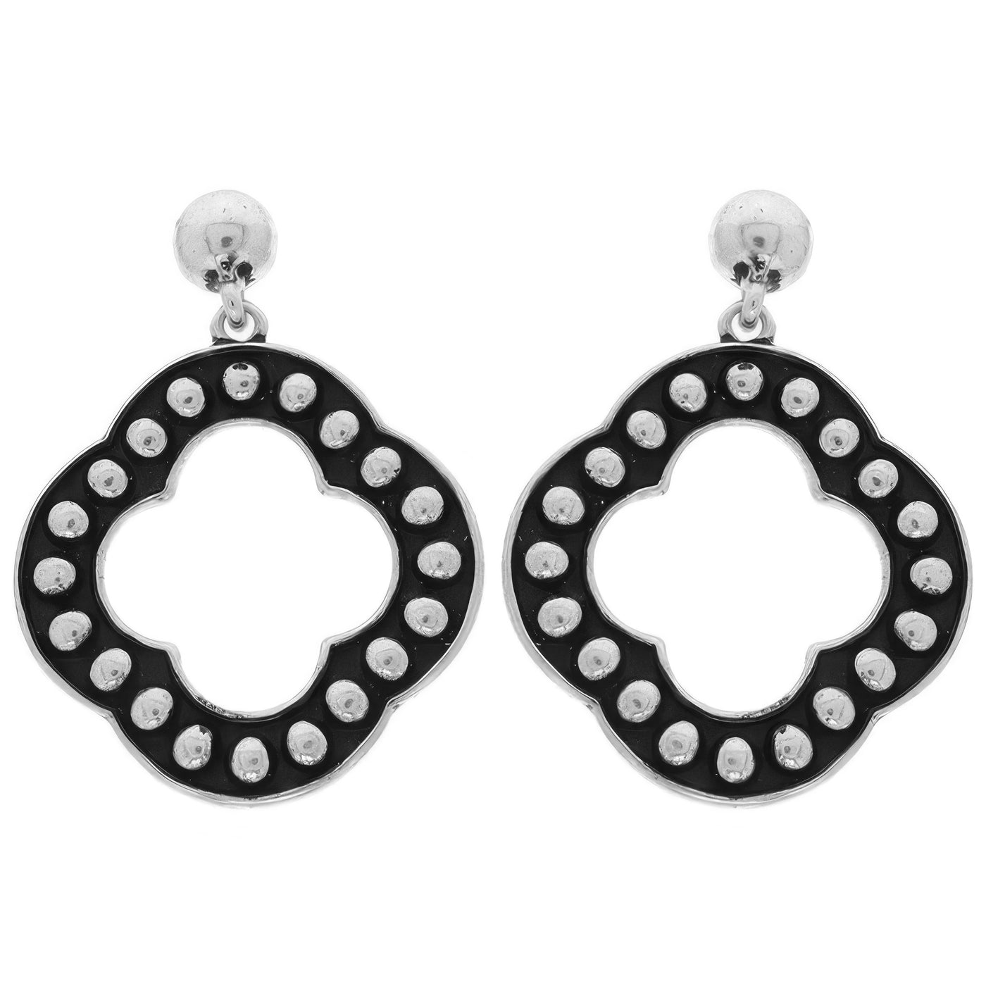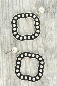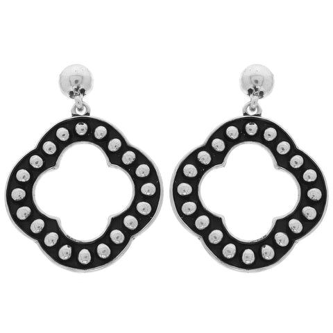Product Description: These western bubble beaded quatrefoil earrings add bold design with a touch of vintage charm. Crafted in oxidized silver-tone metal, they feature a cutout quatrefoil shape accented with textured beading. Lightweight yet eye-catching, they’re perfect for rodeo nights, concerts, or holiday parties.