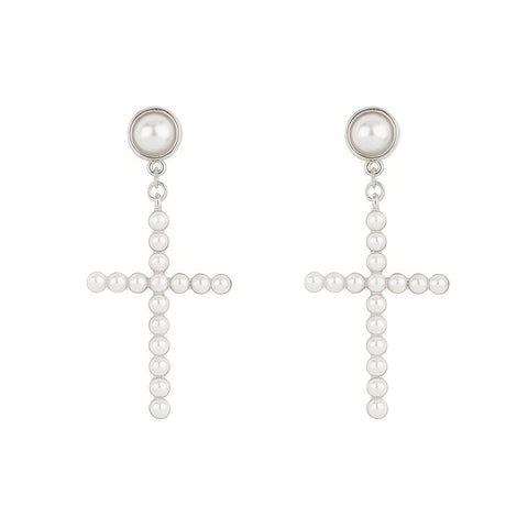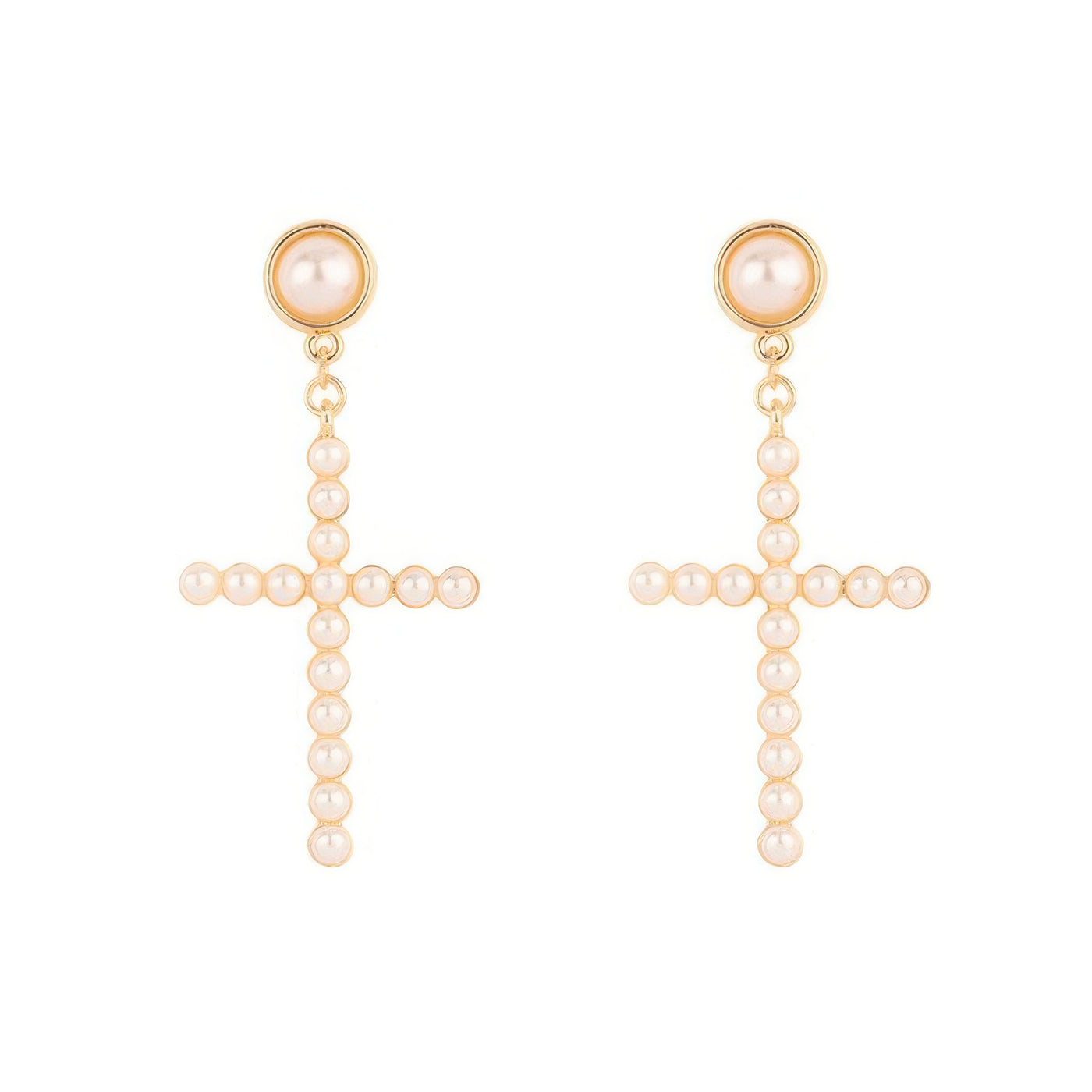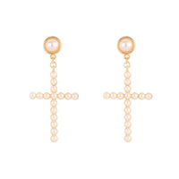Product Description: Make a graceful statement with the Flash-plated White Pearl Pave Cross Earrings. These elegant drop earrings feature a sleek cross silhouette adorned with white pearls and finished in your choice of 18K gold or sterling silver plating. The elongated form brings both spiritual and stylish appeal, making them a standout for faith-inspired fashion or refined holiday looks. A delicate fusion of devotion and modern glamour.