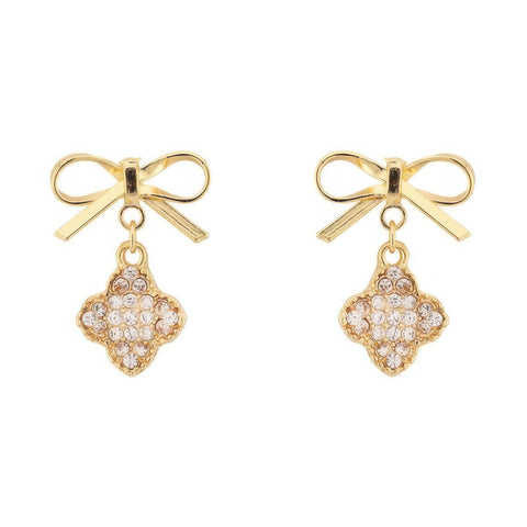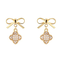Product Description: These bow and clover dangle earrings combine feminine charm with a touch of sparkle. Featuring rhinestone pavé clovers suspended from short-tail bows, they add graceful movement and shine to any look. Available in gold-tone or silver-tone metal, they’re lightweight and versatile for both everyday wear and formal occasions. A chic accessory that doubles as a thoughtful gift.