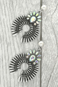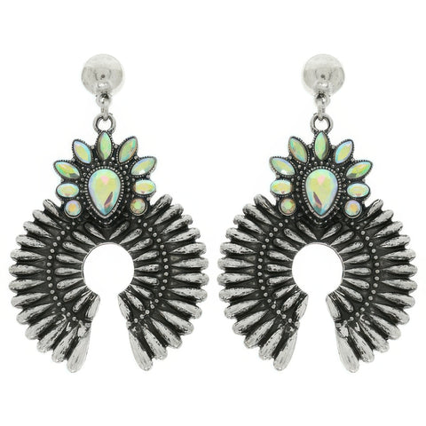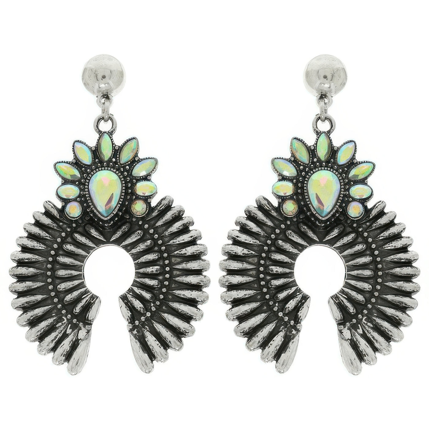 Product Description: Make a bold entrance with the Western Squash Blossom Concho Earrings, a stunning pair that blends floral inspiration with Western elegance. Featuring crystal embellishments and a ribbed concho pattern, these statement earrings are designed to dazzle. The oxidized finish lends a vintage feel, while the floral shape adds a soft, feminine edge. Lightweight yet impactful, they’re perfect for everything from rodeos to rustic weddings. Add them to your collection for an effortlessly glamorous Western accessory that turns heads.