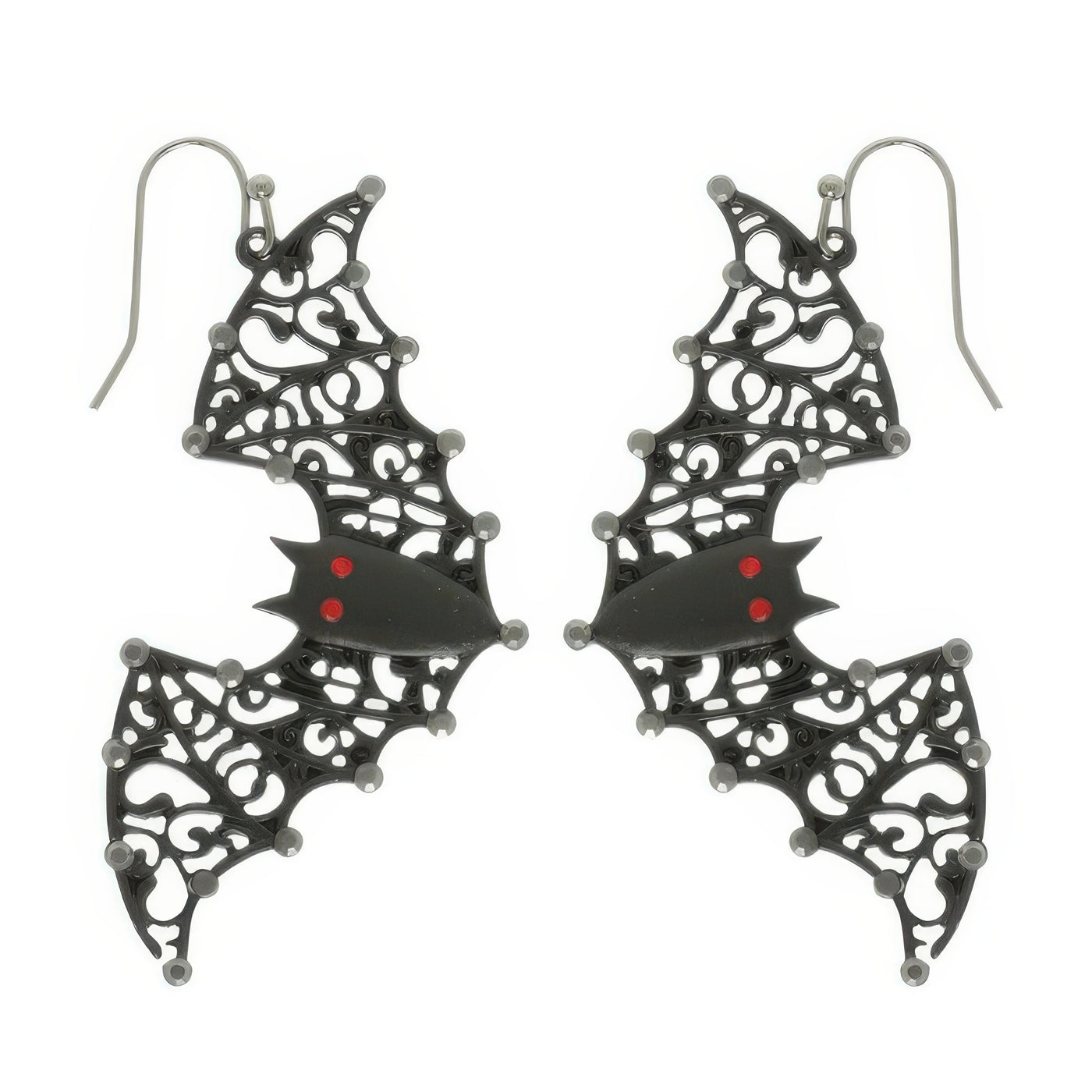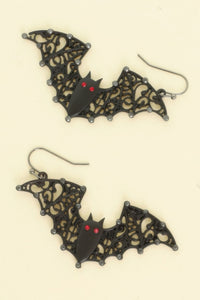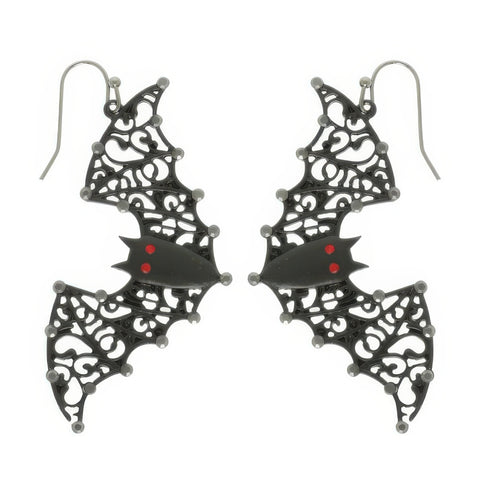 Black epoxy bat dangle earrings with filigree wing accents