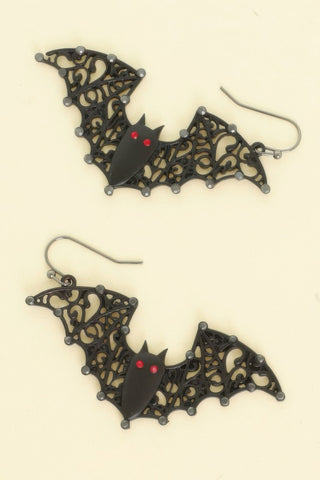 Product Description: Add a bold, spooky accent to your Halloween look with these black epoxy bat earrings. Featuring intricate filigree wing details and a sleek dangle silhouette, these earrings strike the perfect balance between gothic elegance and festive charm. Lightweight and easy to wear, they’re designed for all-day comfort from costume parties to evening events. The shimmering crystal accents offer just the right amount of sparkle to elevate any Halloween outfit. Whether you're dressing up for a party or gifting a fellow Halloween fan, these earrings deliver a hauntingly stylish finish. A must-have accessory for anyone embracing the spooky season.