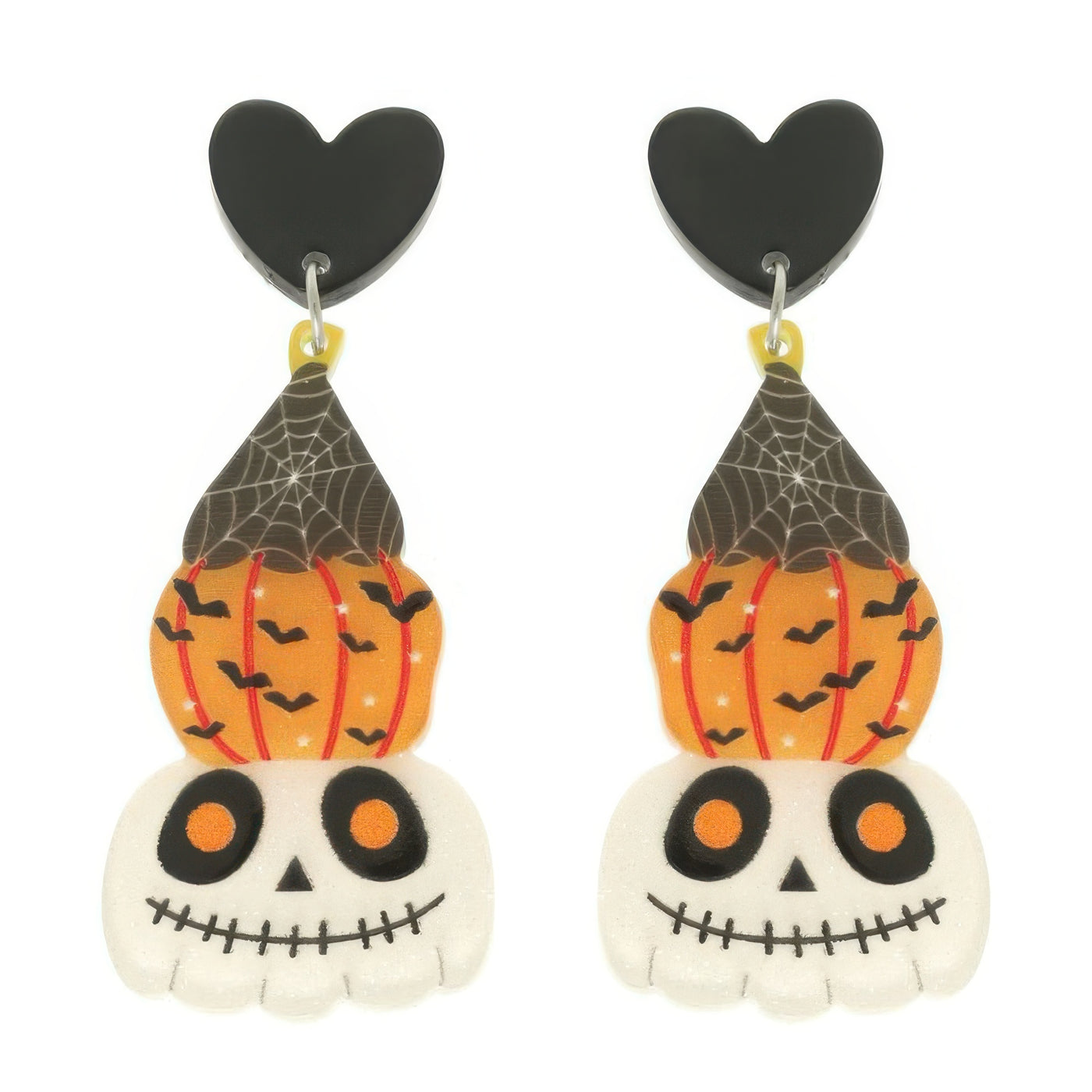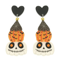 Product Description: Spooky meets stylish in the Halloween Skull and Pumpkin Post Dangle Earrings. With layered skull, heart, and pumpkin shapes topped with a bat-printed spiderweb hat, these earrings are a festive must-have for costume season. Lightweight and eye-catching, they’re the perfect choice for Halloween parties, classroom celebrations, or themed nights out. Make a bold statement while keeping your style playful and fun.