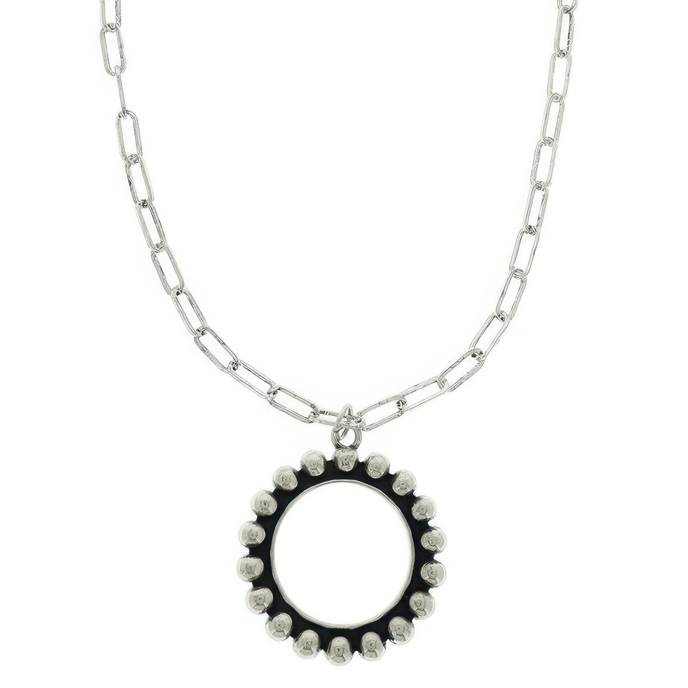 Product Description: Minimalism meets rustic elegance in the Western Circle Bubble Pendant Necklace. Designed with an open-circle silhouette and rigidized texture, this oxidized silver-tone piece offers a bold yet understated look. The long pendant drop adds drama to any outfit while maintaining a clean, modern aesthetic. Whether you're dressing for a weekend getaway or a dinner out, this necklace offers timeless appeal with a Western twist. Its effortless style makes it easy to pair with everyday outfits or statement ensembles.