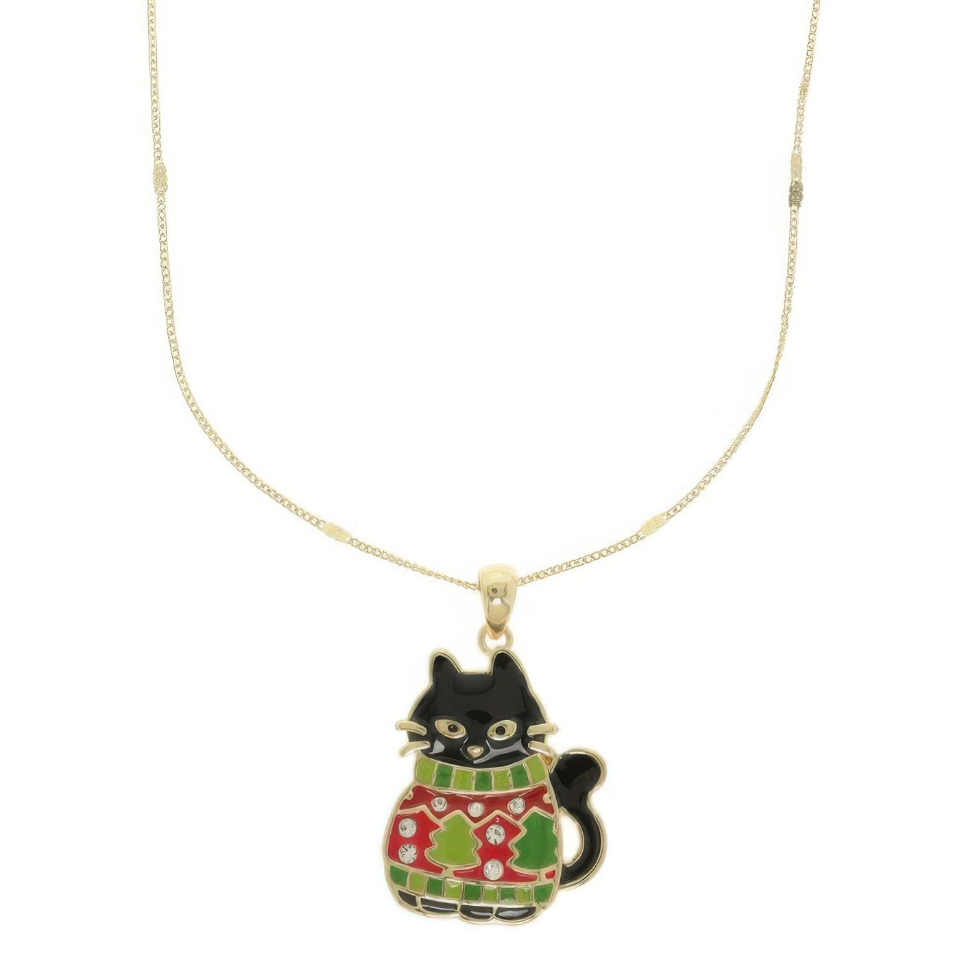 Product Description: Playful and festive, this enamel black cat pendant necklace is dressed in a holiday ugly sweater with sparkling rhinestone accents. The lightweight design and adjustable 18-inch chain make it easy to wear with a variety of outfits. A whimsical piece that adds charm to your seasonal wardrobe, it’s also a delightful gift for cat lovers.