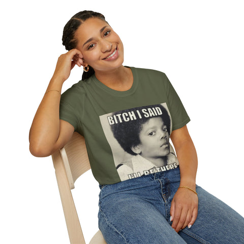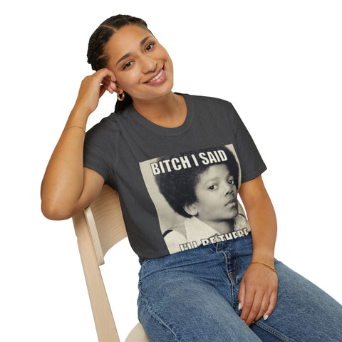 A soft, everyday tee with attitude — this lightweight crew neck carries a vintage-style portrait and bold caption for a confident, playful look. The smooth ring-spun cotton feels gentle against skin while the tubular knit and ribbed collar hold their shape wear after wear. It layers easily under jackets or stands alone as a statement piece for casual days, hangouts, and low-key nights out. The printed front uses high-quality DTG/DTF methods for crisp detail and lasts through regular washing. Clean, simple, and unapologetic — made to be worn, laughed in, and lived in.