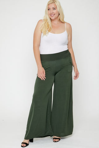 Made In U.S.A 1XL.2XL.3XL High waist palazzo pants featuring pockets, wide legs, and a comfortable stretchy fabric. 96% Polyester 4% Spandex Olive POL