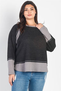 Made In U.S.A 1X.2X.3X Charcoal & grey, colorblock, waffle knit material, round neckline, long sleeves, relaxed fit, unlined, semi-stretchy, non-sheer, casual, cute, girlish, basic, warm, cozy 85% Polyester 11% Rayon 4% Spandex Charcoal Grey TSH