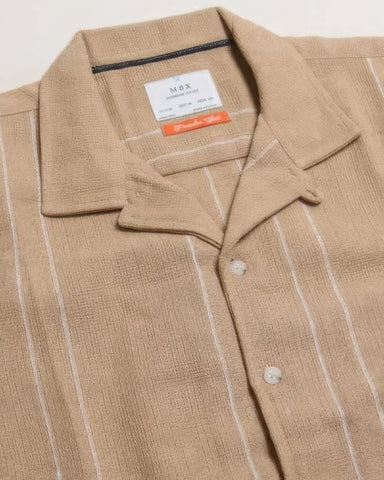 This camp shirt is noted for its stylish design and comfortable fabric blend. The textured stripes and classic color combination make it a versatile and fashionable addition to any wardrobe.