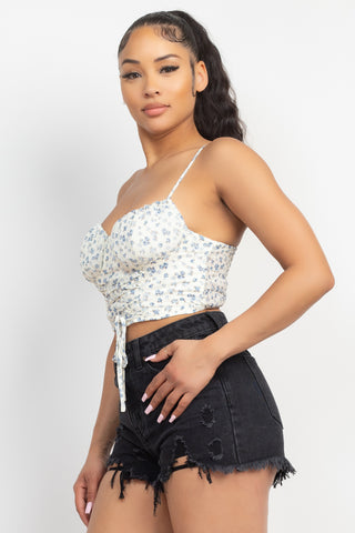 A woven corset top in a ditsy floral print fabric featuring a bustier design, sweetheart neckline, front crossed lace design, adjustable cami straps, smocking back design, and a cropped hem.
