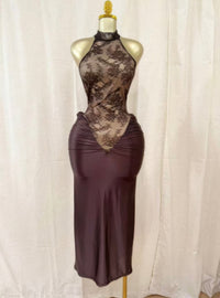 Product Description: Turn heads in the Crimson Lace Hourglass Dress, a stunning fusion of romantic lace and sleek satin. Made from a smooth blend of polyester and spandex, this curve-enhancing midi dress features a halter neckline with sheer floral lace that adds both softness and allure. Side cutouts accentuate the waist, while the ruched satin skirt creates a luxurious drape that highlights your silhouette. Perfect for evening events, date nights, or any special occasion where standout style is a must. Pair with strappy heels and minimal jewelry for a confident, refined finish.