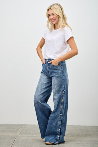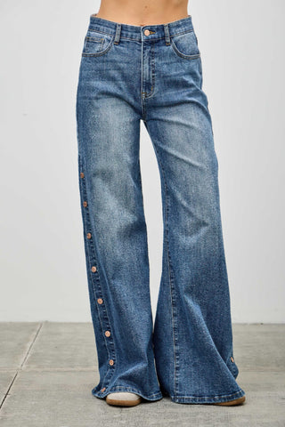 Product Description: Turn heads with these high-rise wide-leg jeans, featuring side slits accented by snap buttons for a bold, customizable finish. The wide-leg silhouette offers a flattering drape, while the high-rise waist defines your shape and elongates the legs. Crafted from a soft stretch denim blend, these jeans deliver both comfort and a clean, structured look. Snap button detailing along the side seams adds a modern twist and styling versatility. Finished with a zipper fly and classic 5-pocket design, this pair is perfect for elevating your denim game.