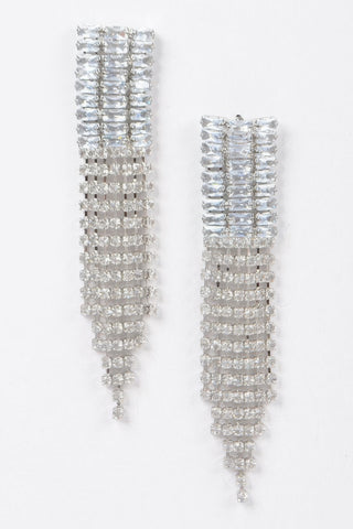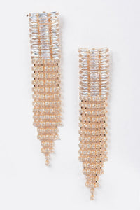 Product Description: Cubic and Stone Fringe Earrings bring texture, shine, and elegant movement to your look. Whether you're choosing the 4-inch or the longer 6-inch variation, these earrings offer an elongated shape that flatters and lengthens the neckline. The combination of cubic accents and shimmering stones gives them an elevated sparkle without being too loud. Designed for comfort and statement appeal, they’re lightweight enough for all-day wear while adding maximum impact. They pair beautifully with sleek dresses, blazers, or layered looks for a night out. The fringe detail creates fluid movement, catching the light with every step. Sizes vary slightly, with approximate measurements ranging from 0.75 to 1 inch wide and 3.25 to 6 inches long.