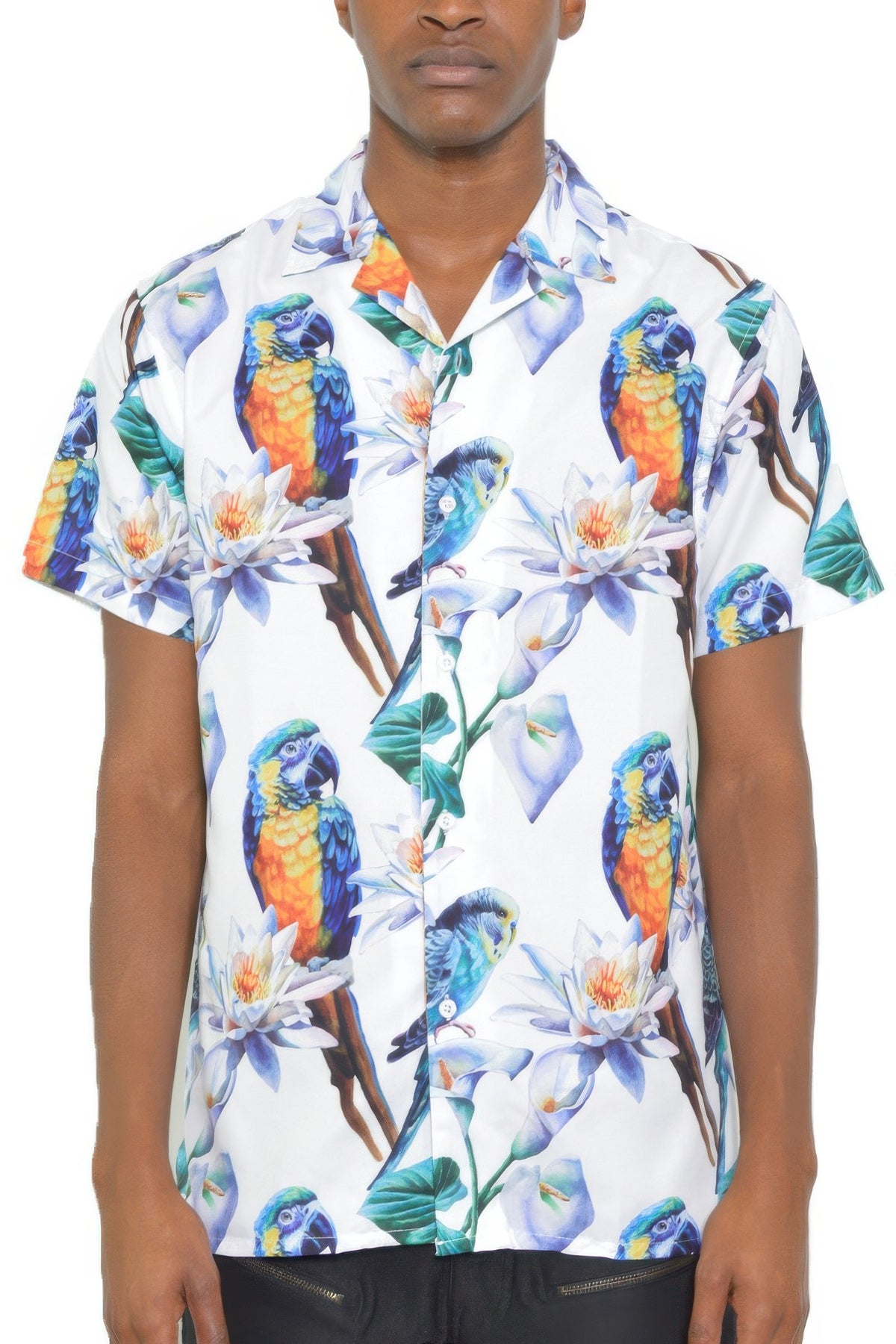 Bring a touch of tropical elegance to your wardrobe with our Men's Tucan Parrot Print Resort Button Down Shirt. Designed to offer both style and comfort, this shirt is perfect for vacations, beach days, or casual summer outings.