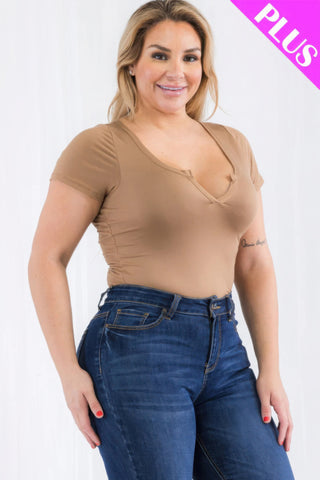 Plus Size Casual Split Neck Solid Short Sleeve Bodysuit - 3XL