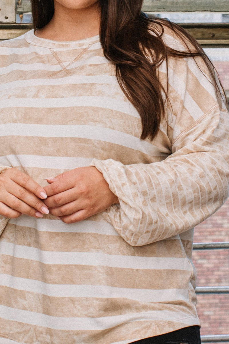 Stripe printed french terry top featuring a round neckline and contrast long sleeves.