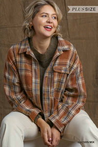 Imported XL.1XL.2XL Plaid Collar Button Down Overshirt with Front Pockets 100% Polyester Brown Mix UMG