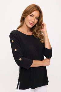 Product Description: Effortless style meets comfort in the Hit Side Button Sleeve Top. Featuring a round neckline and quarter sleeves, this top is adorned with button accents along the sleeve for a refined touch. The soft polyester-spandex blend offers a breathable stretch that moves with you throughout the day. Whether styled for work or a casual outing, it delivers a flattering, easy-to-wear fit. Made in the USA, it’s a timeless staple for every wardrobe.