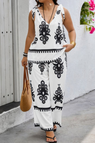 Plus Size Printed Knot Shoulder Wide Leg Sets