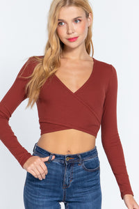 ImportedS,M.LLONG SLEEVE FRONT SURPLICE AND BACK WAIST TIE DETAIL RIB KNIT TOP53% Cotton 37% Polyester 10% Spandex Dark Rust ACT