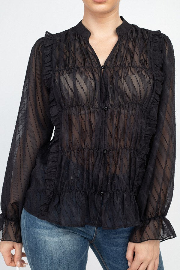 Imported S.M.L A woven blouse featuring a solid color, semi sheer material, ruffle trim, a button down closure, long sleeves, a v-neckline, and a curved hem. 100% Polyester�� Black IRI