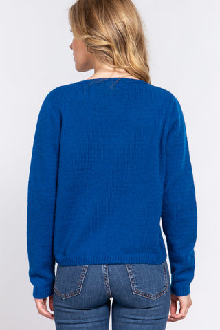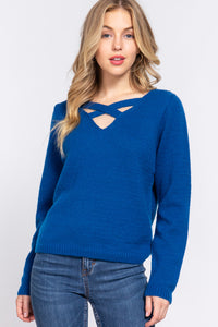 Imported S.M.L LONG SLV X STRAP V-NECK SWEATER 100% Polyester Teal Blue ACT