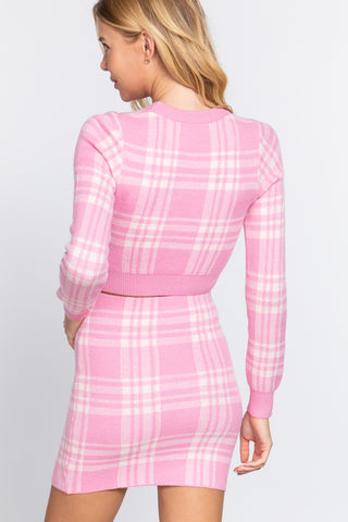 Imported S.M.L LONG SLEEVE ROUND NECK TARTAN CHECK CROP SWEATER 49% Viscose 29% Polyester 22% Nylon Pink/Ivory ACT