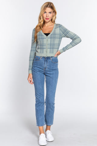 Long Sleeve V-neck Fitted Button Down Plaid Sweater Cardigan - S