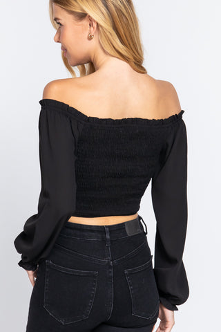 Imported S.M.L LONG SLEEVE OFF THE SHOULDER WITH RUFFLE BACK SMOCKING DETAIL WOVEN TOP 100% Polyester Black ACT